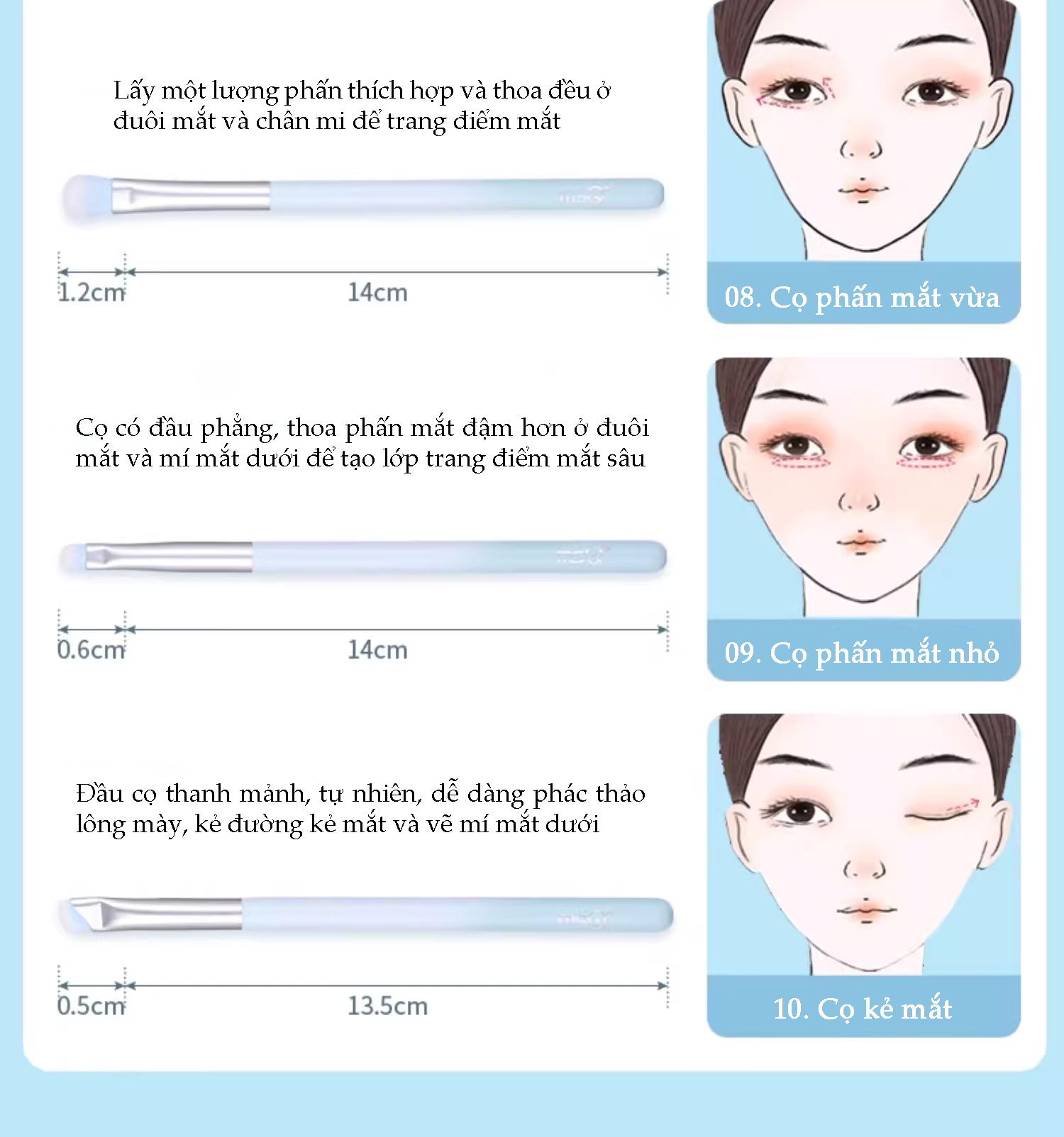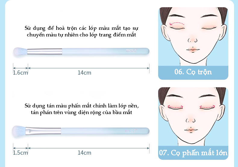 - Cọ phấn mắt: Sử dụng cọ phấn mắt để áp dụng màu phấn lên vùng đầu mắt. Đối với màu sáng, nhẹ nhàng chải qua toàn bộ vùng mí mắt. Đối với màu tối, chải đều lên vùng xếp mí và gấp mí.